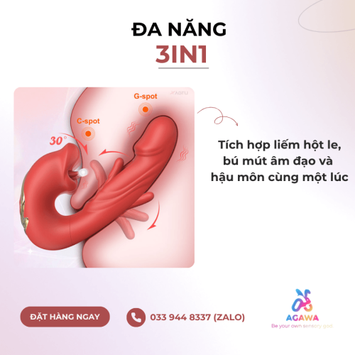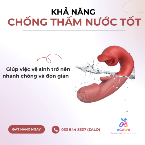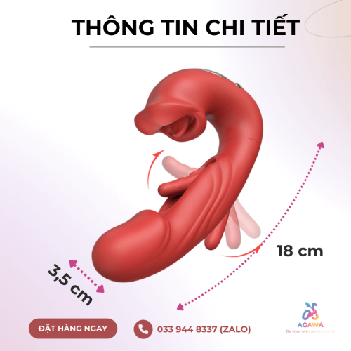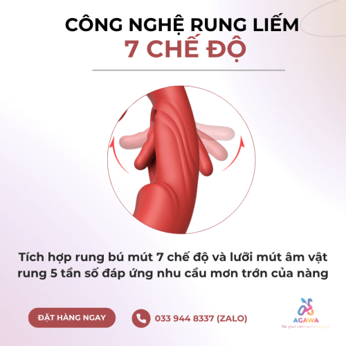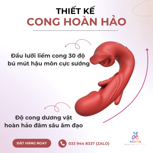 Đầu trên dài 14cm đút sâu bên trong, rung gõ dồn dập kích thích điểm G và điểm A. Đầu dưới tích hợp lưỡi liếm 3D và đôi môi mềm mại bú mút âm vật bên ngoài. Cả hai đầu hoạt động đồng thời – bên trong rung tê, bên ngoài liếm mút – sướng đến run người, ướt đẫm không kiểm soát nổi.